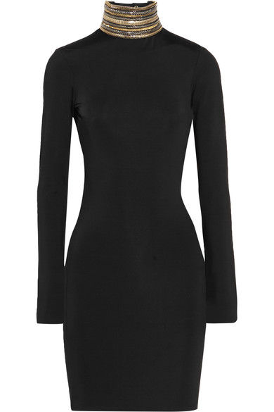 Khloe Kardashian sampled an open back chain embellished stretch-jersey mini dress by Pierre Balmain. The long sleeved dress has a row of metallic chain trims at the neckline,styled with Prada's suede wavy sandals.